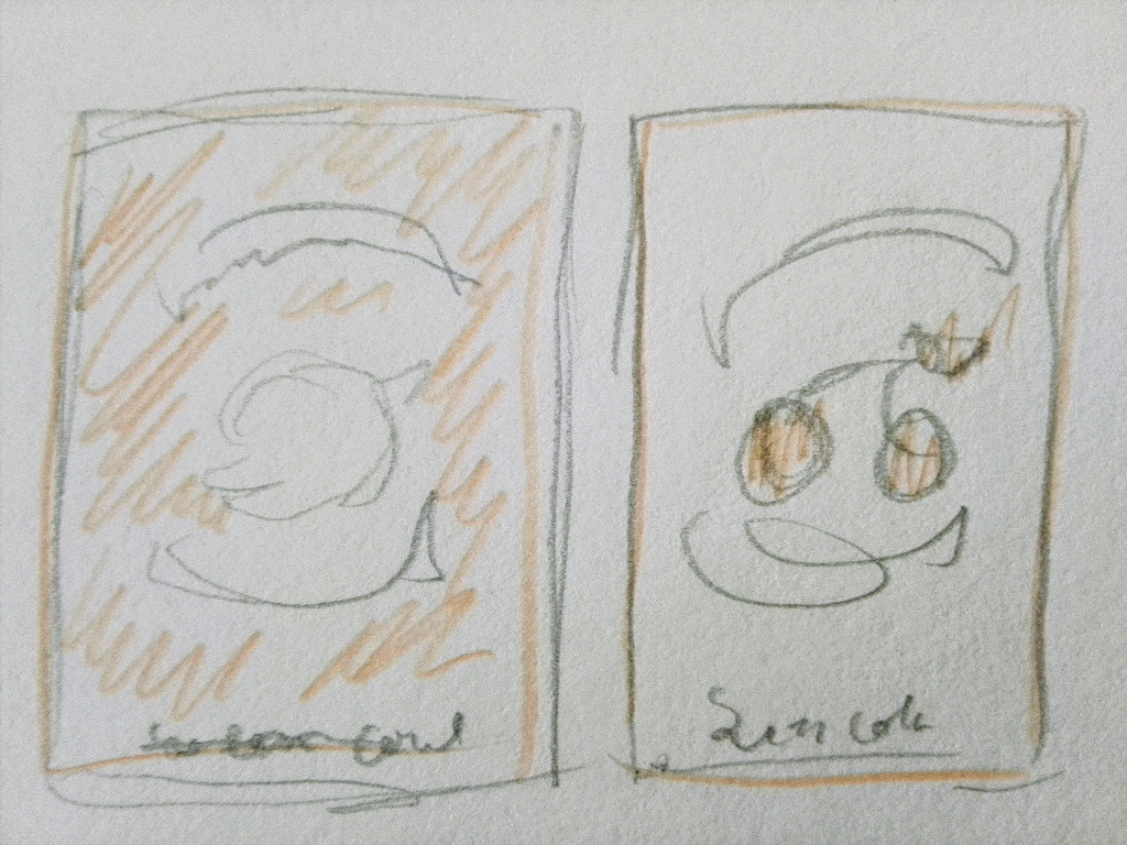 Ci-contre, les croquis qui ont permis de donner sa forme principale au projet, l’idée graphique globale. On y retrouve un fruit au centre entouré en haut et en bas par du texte, et l’indication concernant le lexique des couleurs tout en bas.