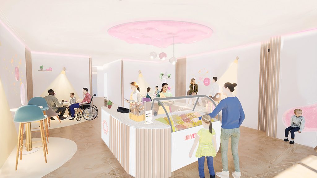Suite à l’attribution aléatoire de deux notions, Humour et Lumière, ainsi que du type de commerce, un glacier, notre mission consistait à concevoir un concept ainsi qu’un aménagement intérieur et extérieur, incluant la devanture et la vitrine.
