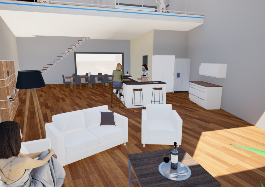 Loft lumineux grâce à ses grandes fenêtres et à la hauteur sous plafond du rez-de-chaussée. Il offre de grands espaces avec une vue dégagée sur l’extérieur. Conçu pour une personne, il permet également d’accueillir des invités grâce à une chambre d’amis.