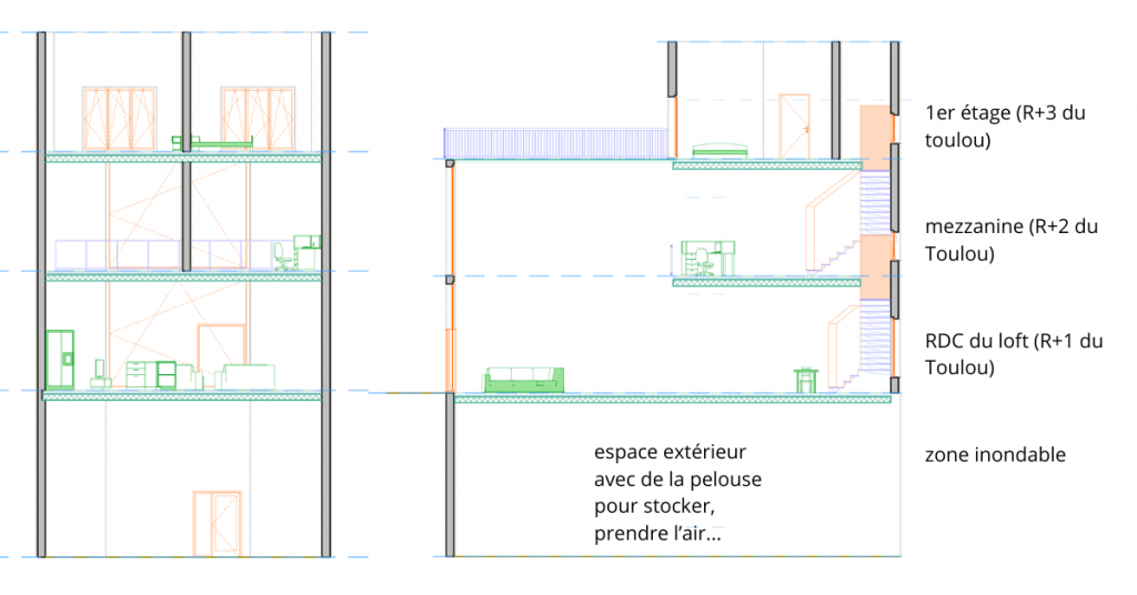 Projet de groupe visant à aménager un tulou de 14 quartiers. Chaque membre de l’équipe a conçu un loft (soit 7 au total), ainsi que des appartements types adaptés aux étudiants et aux personnes à mobilité réduite (PMR). L’aménagement comprenait également des espaces de travail et de réunion, des zones de détente, un réfectoire et une piscine. Une attention particulière a été portée à la prise en compte de la zone inondable, située en bord de Loire.
