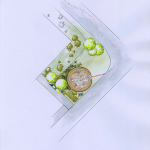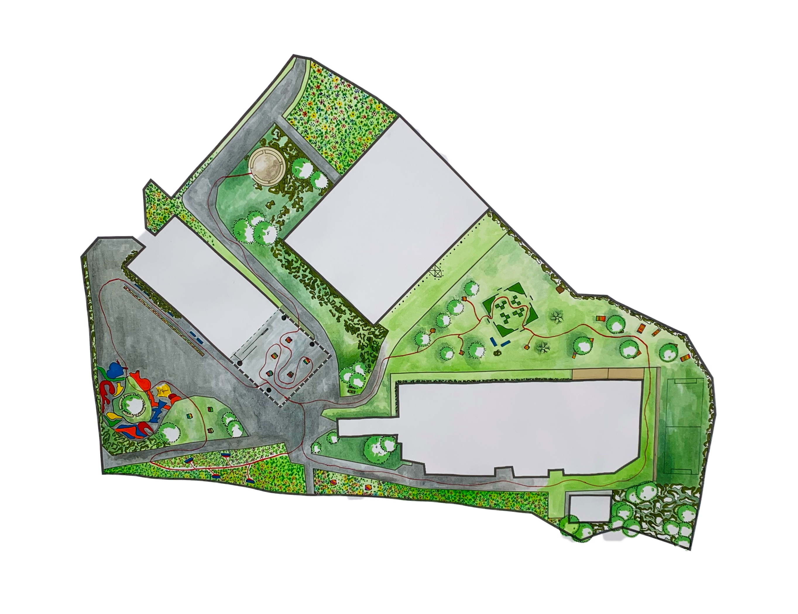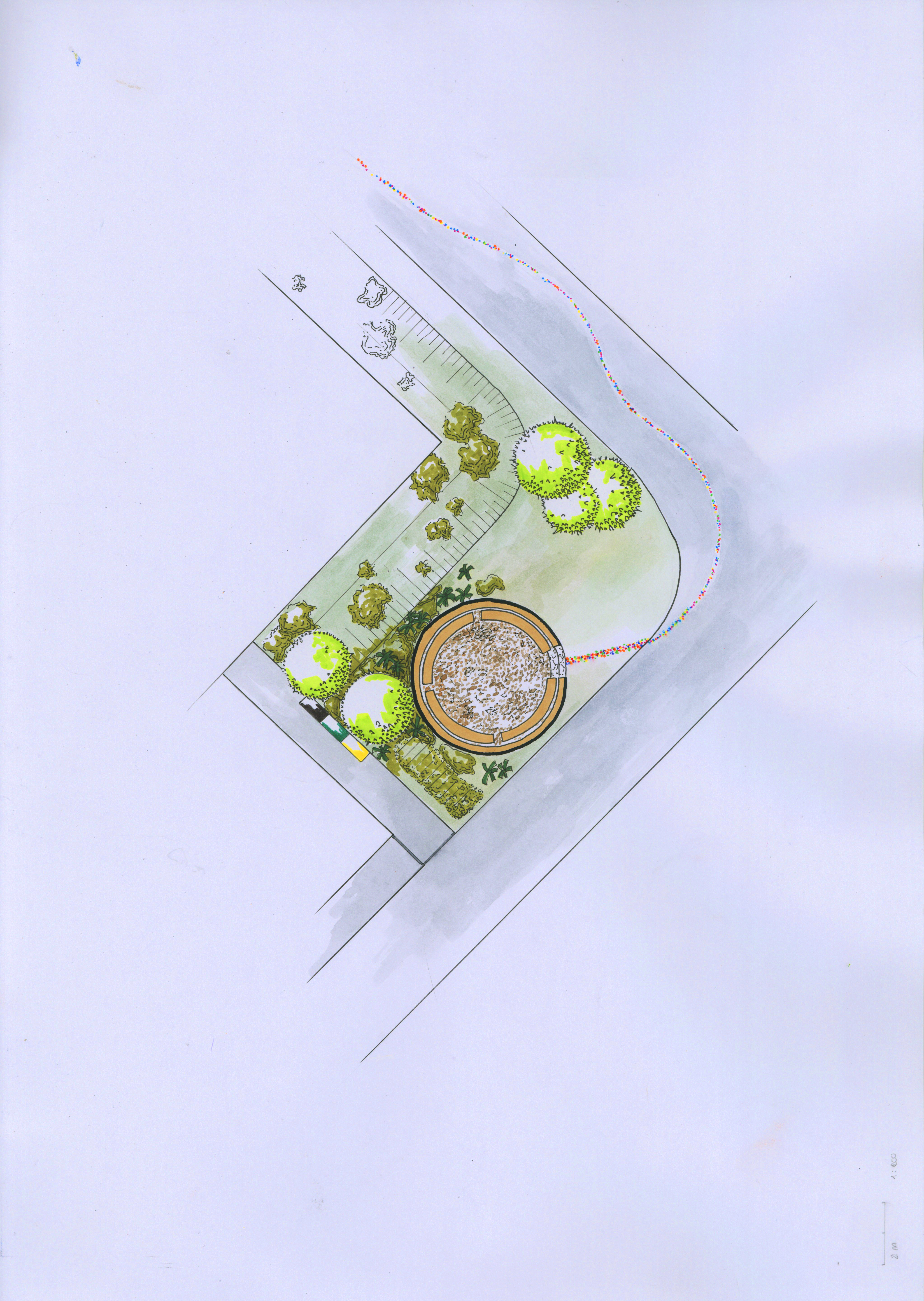Dans ce projet réalisé en groupe de 3, nous avons décidé d’avancer notre réflexion de manière inversée : d’abord en commençant par végétaliser l’entièreté du site, pour ensuite y découper les différents espaces et chemins de circulation. Un « trait » rouge propose un guidage vers les espaces clé de l’enceinte, fabriqués à base de petits bouts de verre recyclés incrustés dans le bitume.