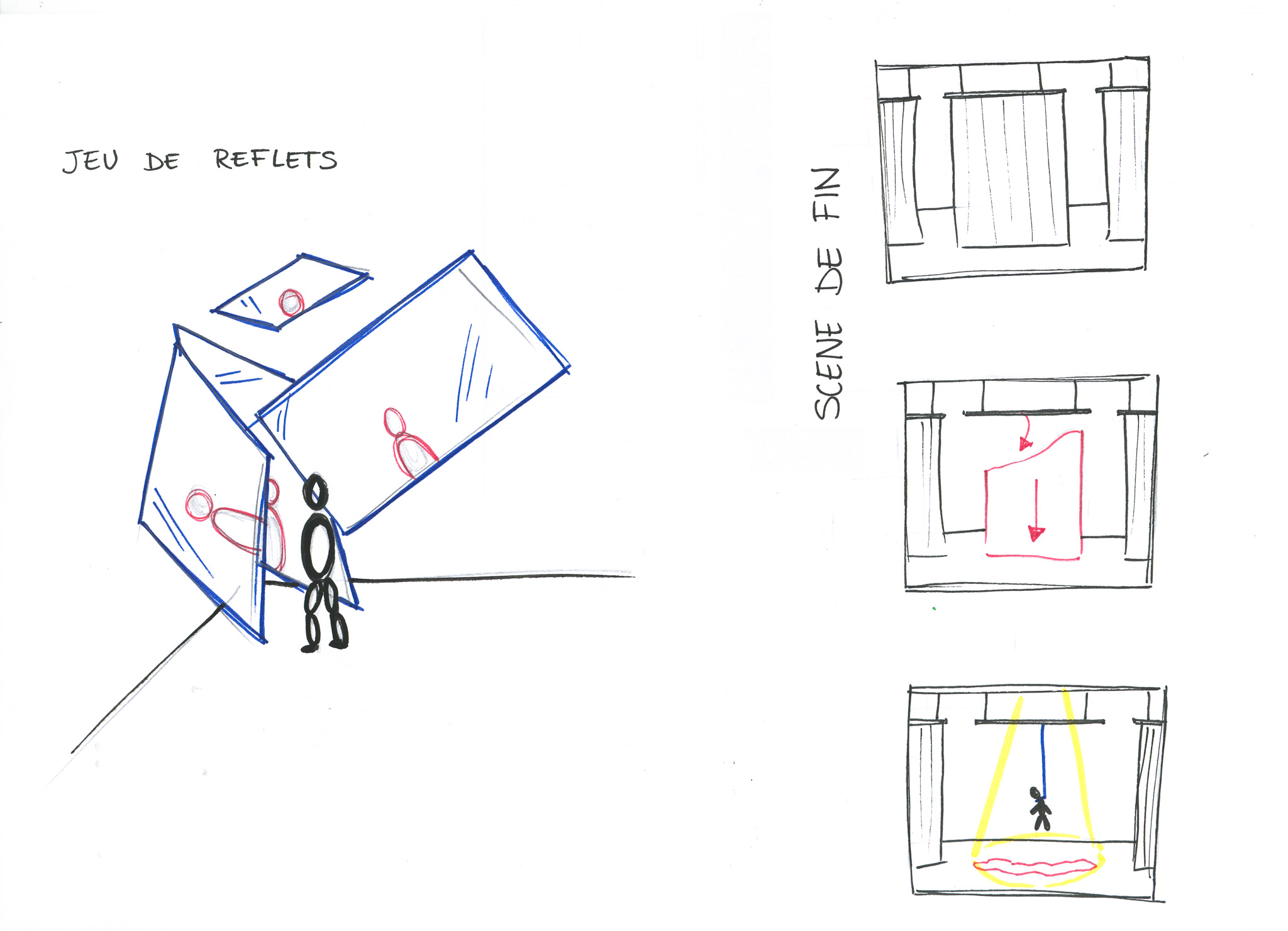 Ces différents niveaux laissent libre cours à l’interprétation et aux mouvements des acteurs, et les miroirs suspendus reflètent et jouent avec cet état d’esprit…
