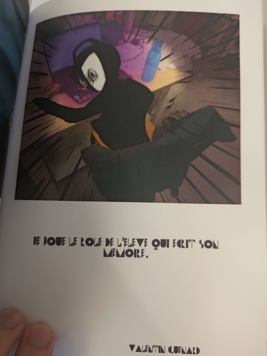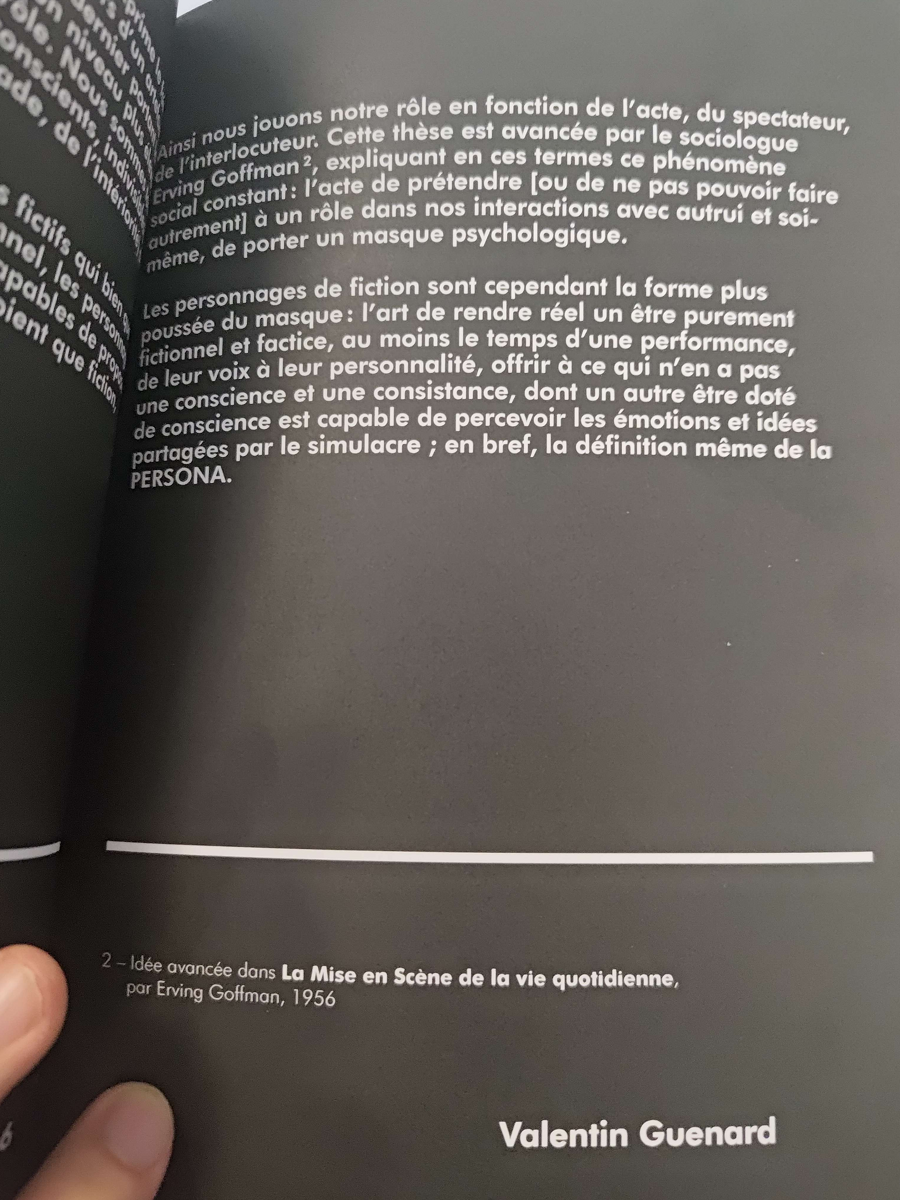 Ainsi, lors de la conception de mon mémoire, je me suis donné pour mission de concevoir un dispositif visuel qui retranscrirait la dualité de l’être, construit de son vrai et de son faux, de son noir et de son blanc. J’ai donc entrepris une production à double-je, à la fois présentant ma réflexion des plus sincère, mais aussi quelque facéties propres à ma personne, pour que ce travail reste personnel. Car après tout, jouer le rôle de l’élève propre n’est que un masque que je porte de manière courante, n’est ce pas ?